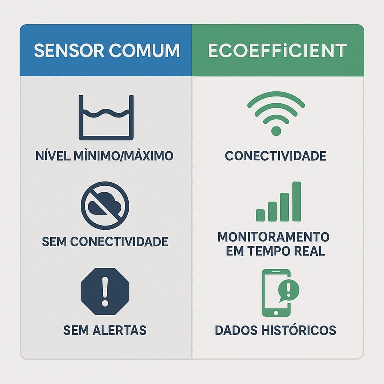 Se você quer apenas saber se há água na caixa, um sensor comum pode servir. Mas se o objetivo é evitar desperdícios, garantir abastecimento constante, prevenir danos em equipamentos caros e economizar na conta, o sistema da EcoEffiCient é a escolha certa.